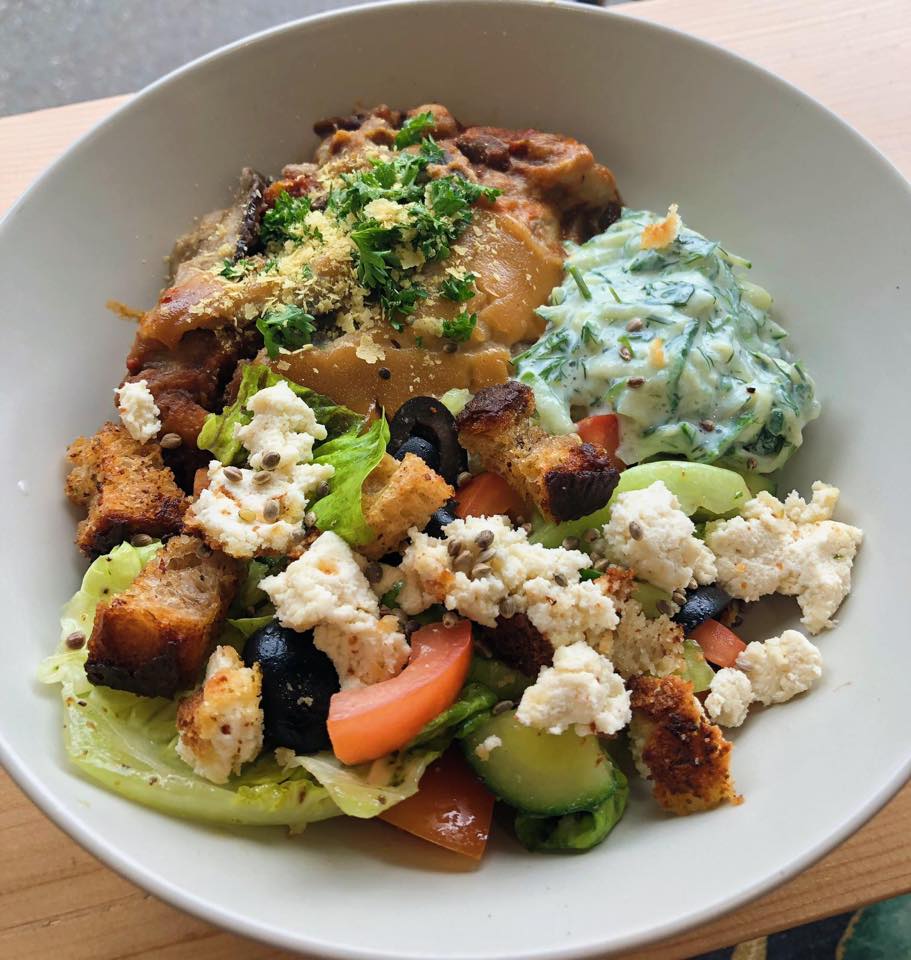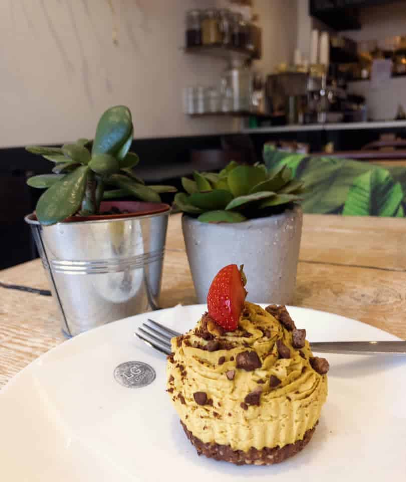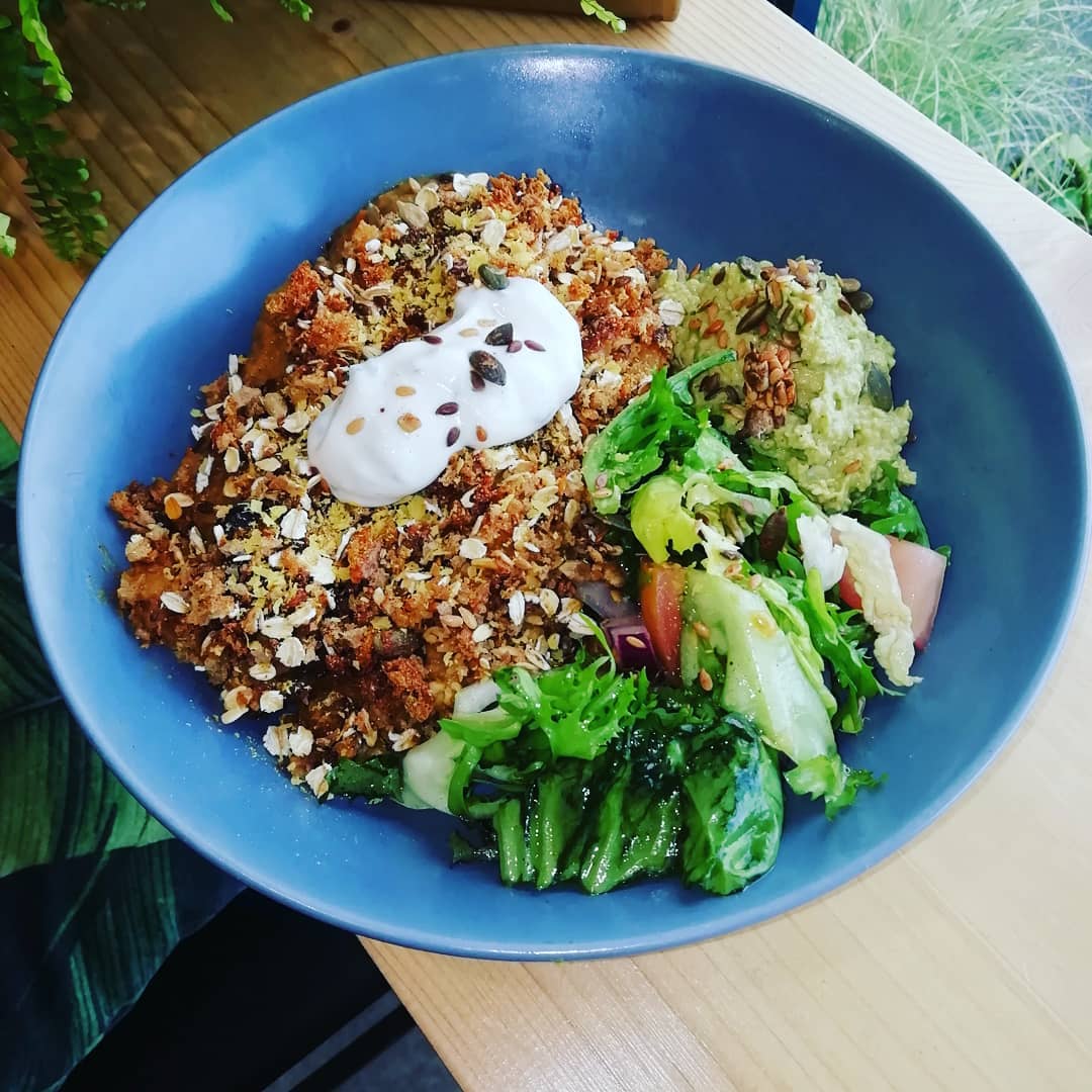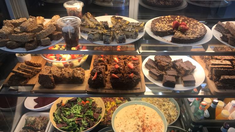 Deli / cafe offering a range of healthy plant-based food and drink options from salads and juices to coffee and raw sweet treats